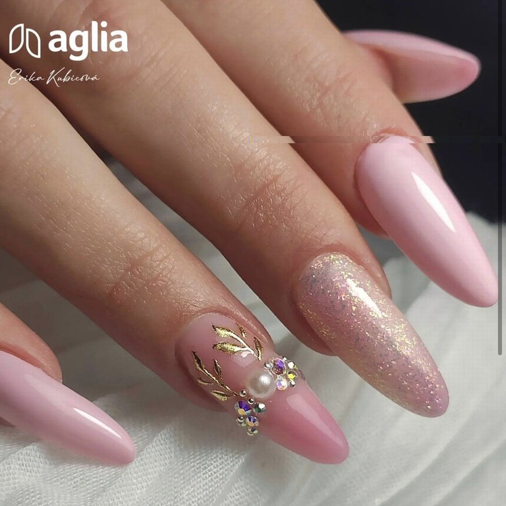 Postup: Na vytvrzený barevný gel "naťupejte" malé množství vloček. Zbytek jemně oprašte a zafixujte libovolným top coatem.