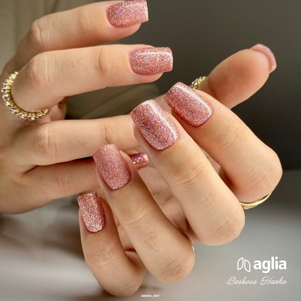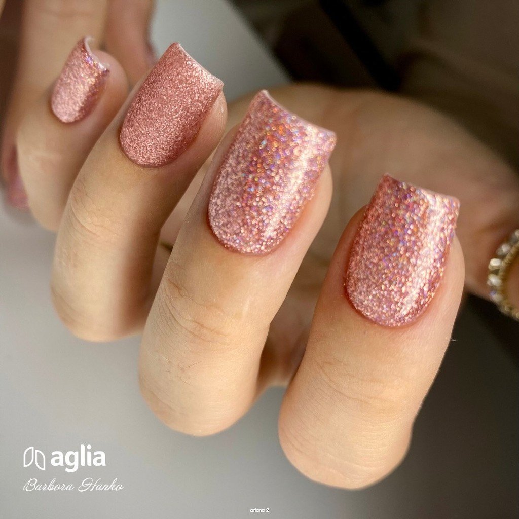 Růžový glitrový UV gel na nehty s holografickým efektem.