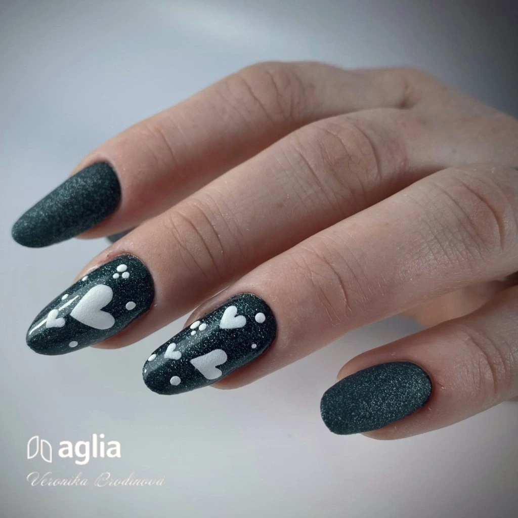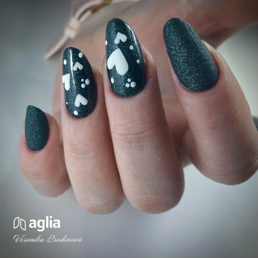 Zeleno-černý UV gel na nehty s holografickými glitry.