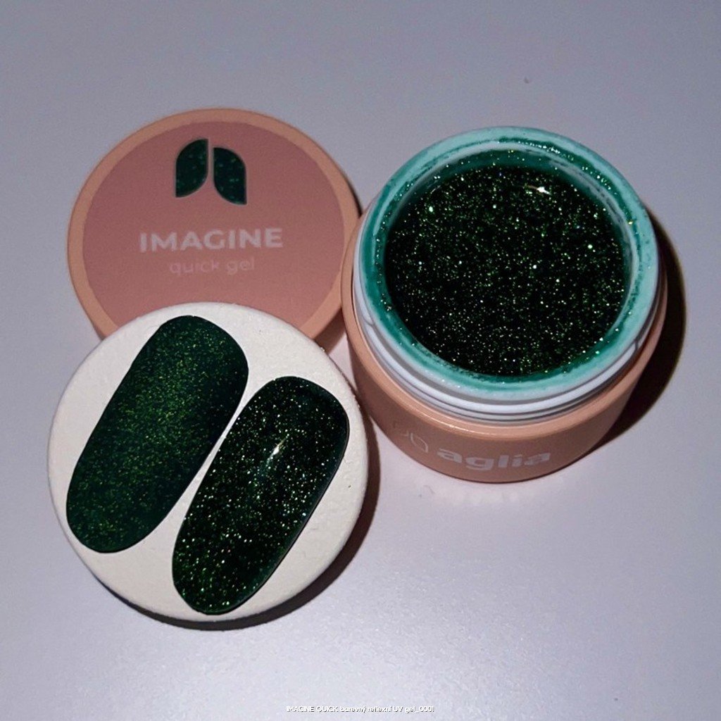 Tmavě zelený reflexní UV gel na nehty s jemnými holografickými třpytkami, který nádherně vynikne při umělém osvětlení.